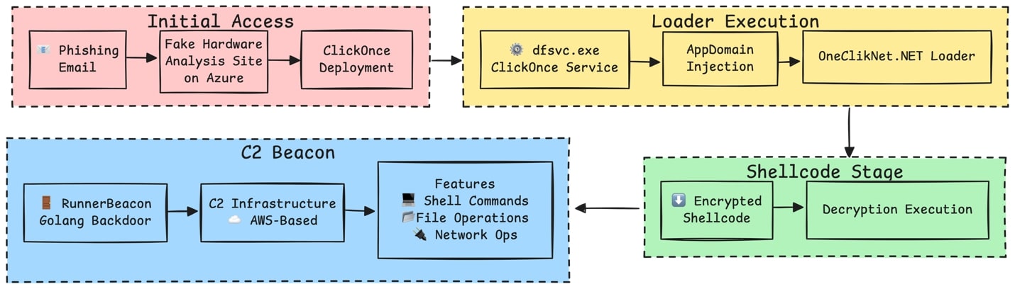 ClickOnce is a Microsoft deployment technology allowing near-zero-interaction app installation. Attackers can weaponize it to deploy implants via trusted Windows processes (dfsvc.exe).