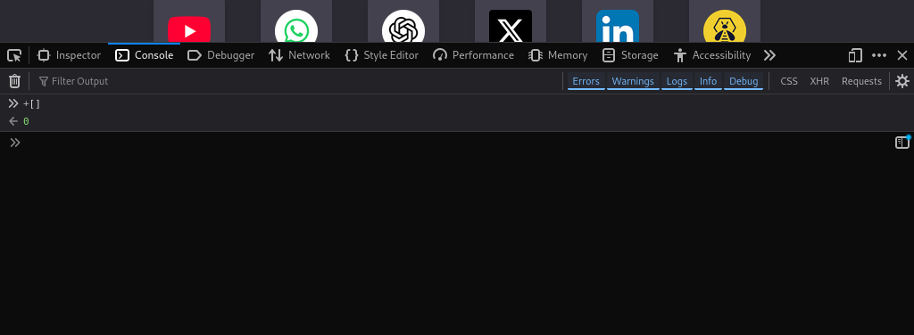How does this work? In JavaScript, [] denotes an empty array. When you put a + in front of it, JavaScript automatically coerces it into a numeric type. Because an empty array has no content, converting it to a number yields 0.
