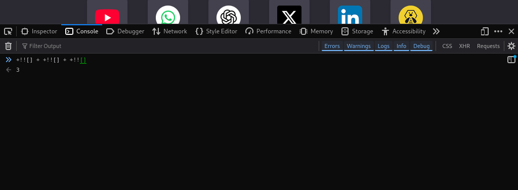 JSFuck is valid JavaScript code, meaning that JSFuck programs can be run in any web browser or engine that interprets JavaScript. JSFuck is able to recreate all JavaScript functionality using such a limited set of characters because JavaScript allows the evaluation of any expression as any type.