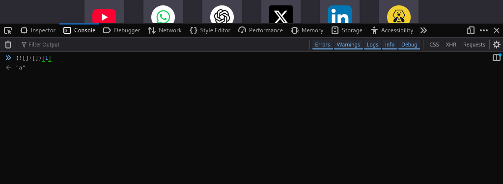 To select the second letter of the word False, we need the first offset (second character) of the string. We do this by enclosing the original symbols in parentheses and using 1 for the offset, so (![]+[])[1] is the code that generates the letter a.