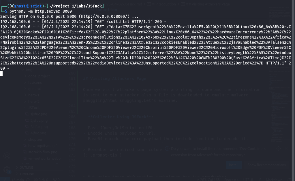 Once we visit attackers page system profiling is done and the information is sent to our attacker also a file is downloaded to emulate malware smuggling/html smuggling.Let’s examine.