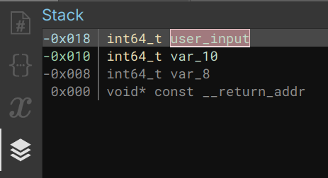 As evident, this display reveals the variable offsets within the stack, accompanied by their respective types and names. At 0x0, you can consistently locate the return address (eip/rip). The negative offsets pertain to local variables declared within the function, while the positive offsets correspond to non-local variables, frequently established through functions like malloc, calloc, and the like.